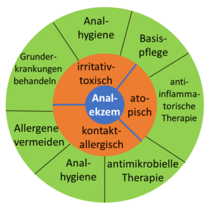 Ziel der Behandlung des Analekzems ist einerseits die schnelle Linderung der Symptome, andererseits die komplette Abheilung und das Verhindern eines Rückfalls. Dafür ist es wichtig, im Zuge der Behandlung vor allem die auslösenden Faktoren möglichst vollständig zu beseitigen. Am Beginn jeder therapeutischen Intervention steht deshalb die Diagnose und Identifizierung der Ekzemform. Die Therapie gliedert sich letztlich in drei Säulen: Beseitigung der auslösenden Faktoren, nichtmedikamentöse Therapie und antientzündliche Therapie (Abbildung 2).