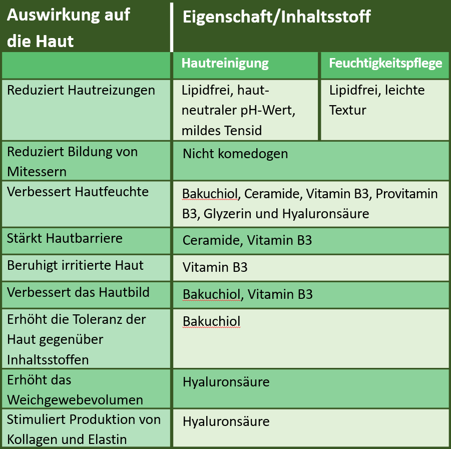 Tabelle 1: Eigenschaften und Inhaltsstoffe von Hautreinigungsprodukten und Feuchtigkeitspflege.