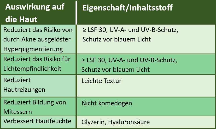 Eine Vielzahl an Hautpflegeprodukten kann die oben vorgestellten Behandlungsstrategien unterstützen. Dazu gehören insbesondere Reinigungsprodukte, Feuchtigkeitspflege und Produkte zum Schutz vor Lichteinstrahlung. Lichtschutzprodukte beugen Hyperpigmentierung und lichtbedingter Hautalterung vor. Sie sollten einen Lichtschutzfaktor (LSF) von mindestens 30 aufweisen und möglichst auch vor UV-A-Licht und blauem sichtbaren Licht schützen. Alle Pflege- und Hautschutzprodukte sollten speziell auf die Bedürfnisse von empfindlicher und an Akne erkrankter Haut abgestimmt sein (Tabellen 1 und 2). Dazu gehört, dass sie keine reizenden oder allergenen Inhaltsstoffe enthalten und einen hautneutralen pH-Wert aufweisen, um den Säuremantel der Haut zu schützen. Ein niedriger Lipidanteil verhindert, dass Hautporen und Talgdrüsen verstopfen, was die Bildung von Mitessern fördert.